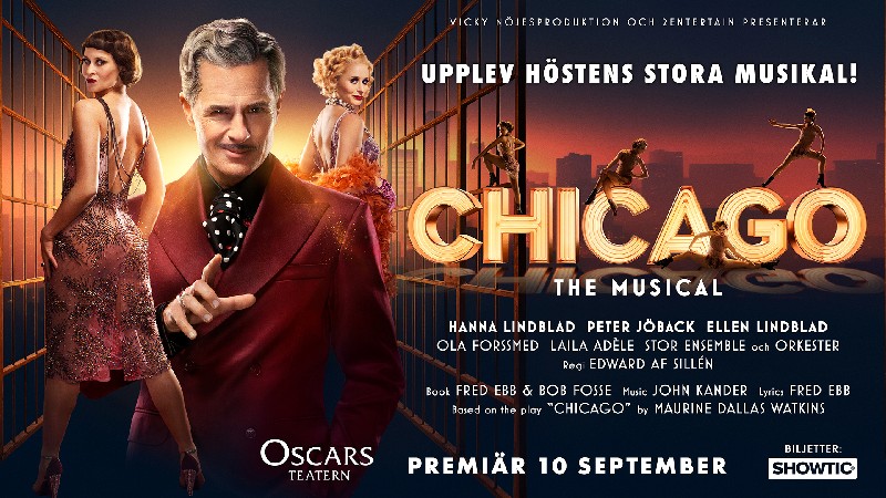 Den världsberömda musikalen Chicago intar Oscarsteatern i höst i en storslagen, påkostad, svensk uppsättning. I regi av Edward af Sillén och med världsstjärnan Peter Jöback och systrarna Hanna och Ellen Lindblad i huvudrollerna bjuds publiken på en glittrande musikalupplevelse fylld av jazz, 1920-talsglamour och spektakulära shownummer. Chicago är en prisbelönt Broadway-klassiker där mord, berömmelse och showbusiness möts i en sylvass och underhållande satir.